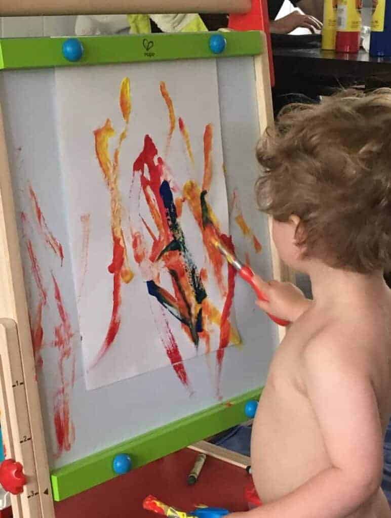 Easel and paper: I just recently read and shared this great article about how beneficial it is for kids to work on vertical spaces. According to the article, written by a pediatric physical therapist, working on vertical spaces helps with coordination, crossing the midline, pencil grip, posture, core strength among other things.
