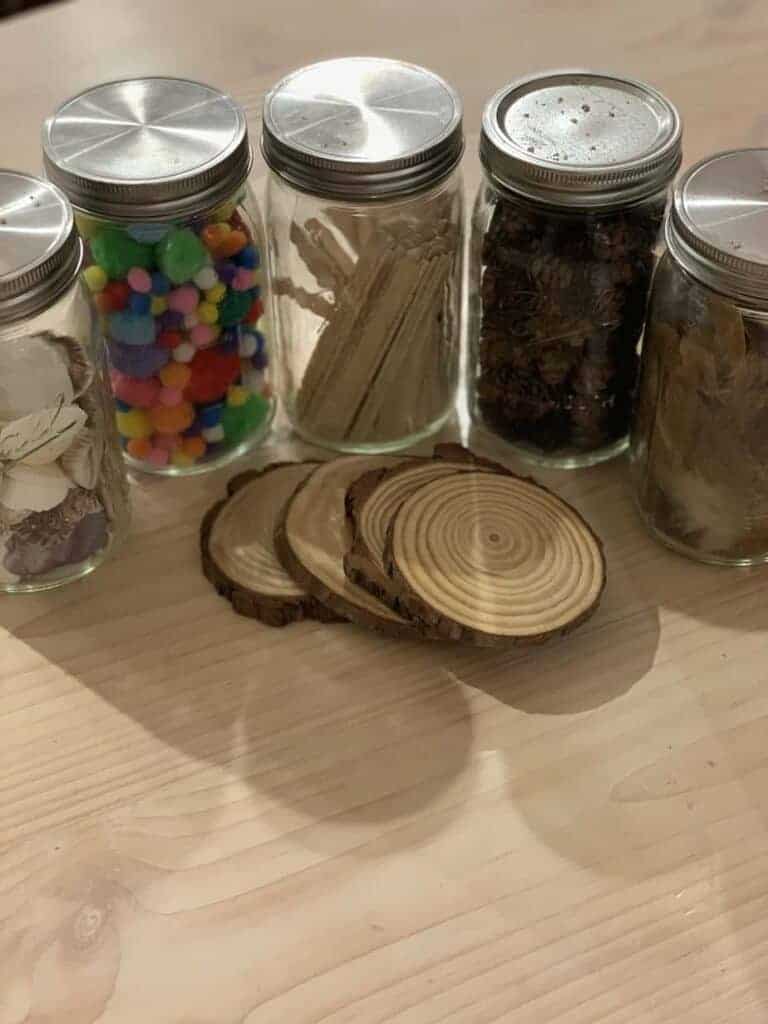 Loose parts: We have a bunch of different loose parts that the kids use for arts and child led crafts. We have a stack of wood slices that my kids love to paint and glue things to and I have mason jars of the following: