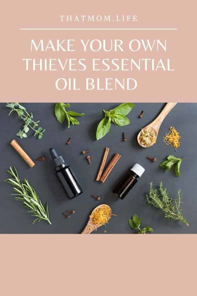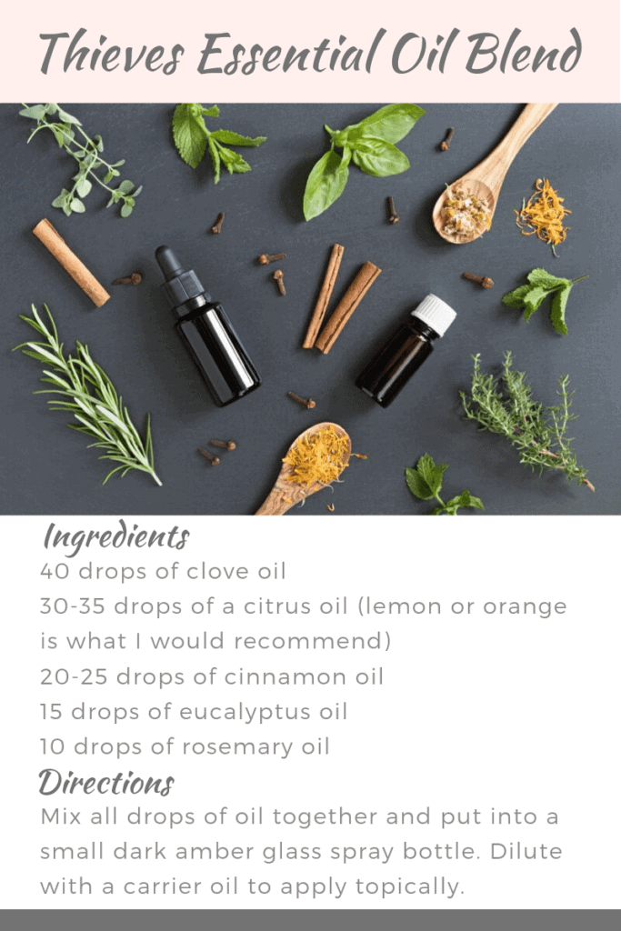 Thieves oil blend is a common blend of clove, rosemary, cinnamon, eucalyptus and citrus oils that is often used to help fight germs and boost immunity. The blend is said to be inspired by a 15th century band of thieves who covered themselves in these aromatics so they could steal from people who died of the bubonic plague. None of them contracted the disease, and when they were caught they received a reduced sentence for sharing the secret blend that kept them safe.